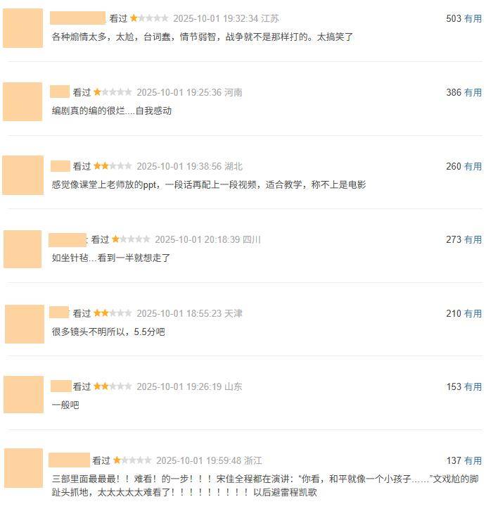 很是令人裂开的是陈凯歌的《意愿军3》——说好的从旋律王炸呢?评论区实的成了吐槽大会现场:PPT三部曲相当失望没有之一的差评刷得飞起。硬是被拍成了像的拼盘菜。文戏全程复读和平鸽标语,武戏动不动就搞抗日神剧式操做,看得人脚趾抠出三室一厅!